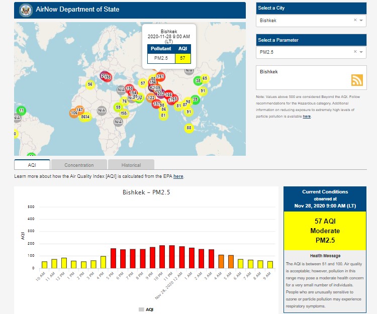 Посольство США в Кыргызстане также установило датчик. Он показывает индекс качества воздуха в режиме онлайн. Информация обновляется ежечасно.