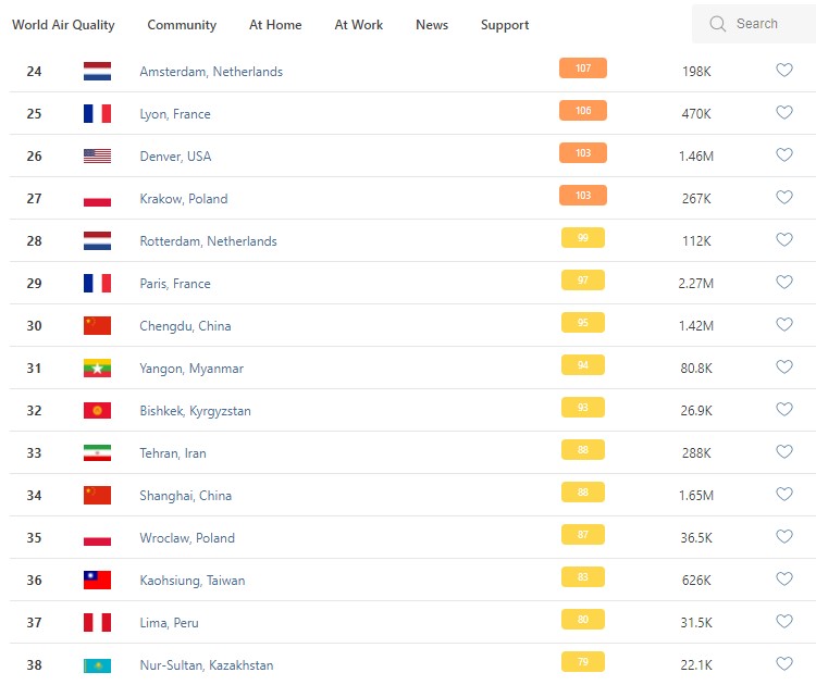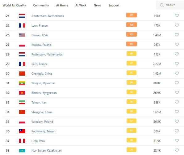 В рейтинге крупнейших городов мира по качеству воздуха World Air Quality на 9.30 Бишкек опустился на 32-е место.