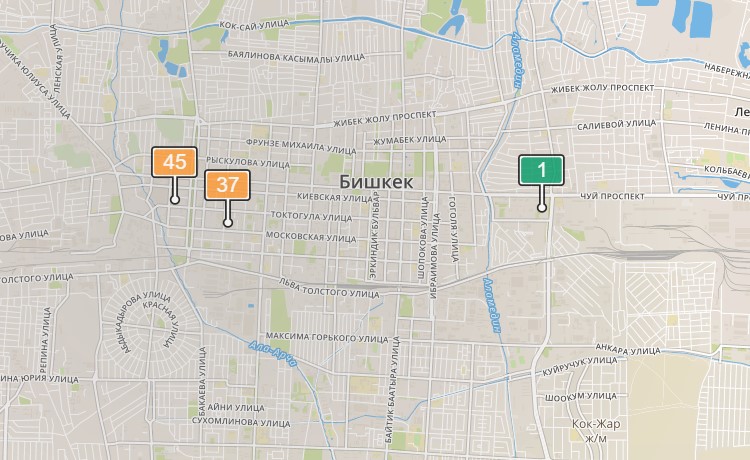 - в районе улиц Бейшеналиевой/Токтогула. Уровень загрязнения превышен в 3,97 раза: PM2.5 среднесуточный — 139 мкг/м³, на момент измерения — 45 мкг/м³;