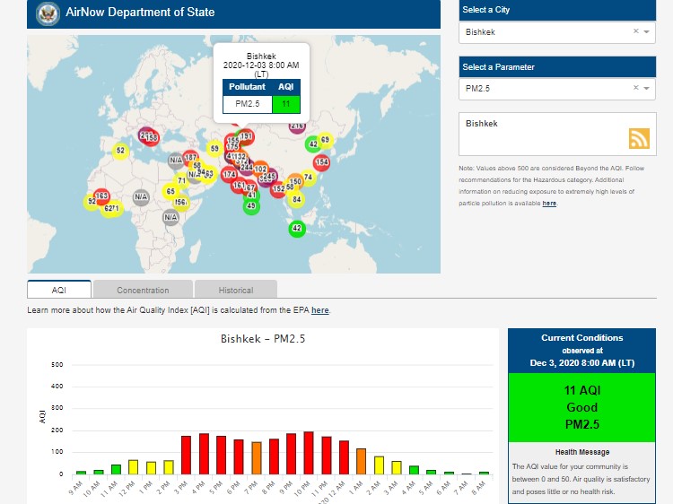 Посольство США в Кыргызстане также установило датчик. Он показывает индекс качества воздуха в режиме онлайн. Информация обновляется ежечасно.