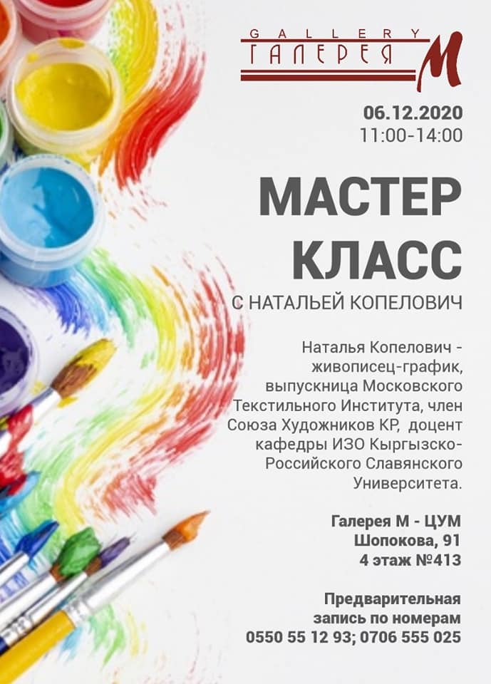 Мастер-класс по живописи проведет художница Наталья Копелович. В стоимость включены материалы и кофе-брейк. Регистрация по телефону 0550551293.