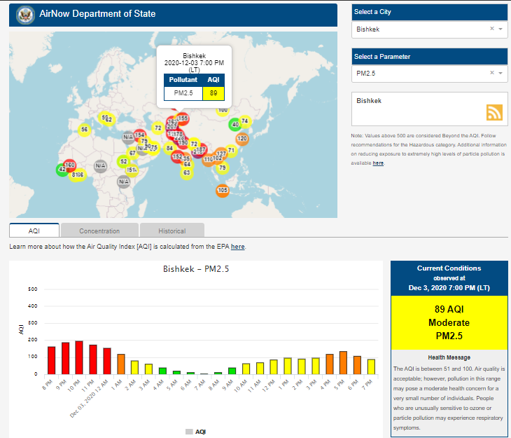 Посольство США в Кыргызстане также установило датчик. Он показывает индекс качества воздуха в режиме онлайн. Информация обновляется ежечасно.