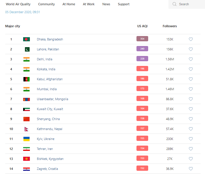 В рейтинге крупнейших городов мира по качеству воздуха World Air Quality на 9.30 Бишкек находится на 13-м месте.