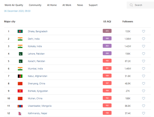 В рейтинге крупнейших городов мира по качеству воздуха World Air Quality на 9.30 Бишкек опустился на 9-е место.