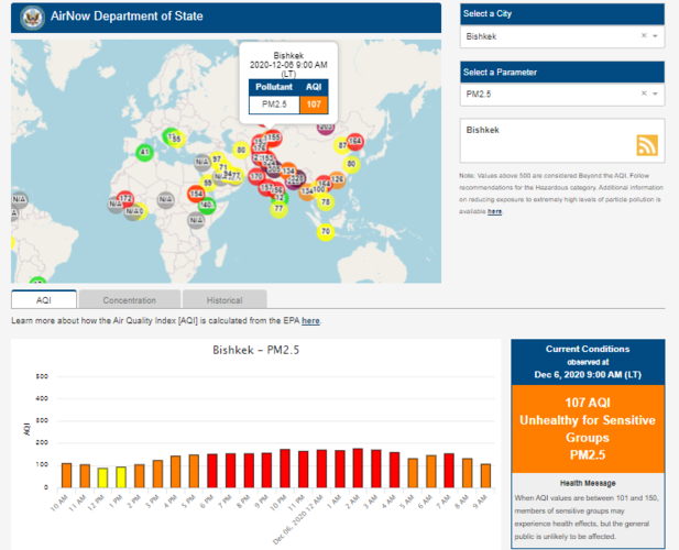 Посольство США в Кыргызстане также установило датчик. Он показывает индекс качества воздуха в режиме онлайн. Информация обновляется ежечасно.