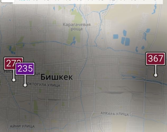 - в районе улиц Бейшеналиевой/Токтогула. Уровень загрязнения превышен в 8,14 раза: PM2.5 среднесуточный — 285 мкг/м³, на момент измерения — 273 мкг/м³;