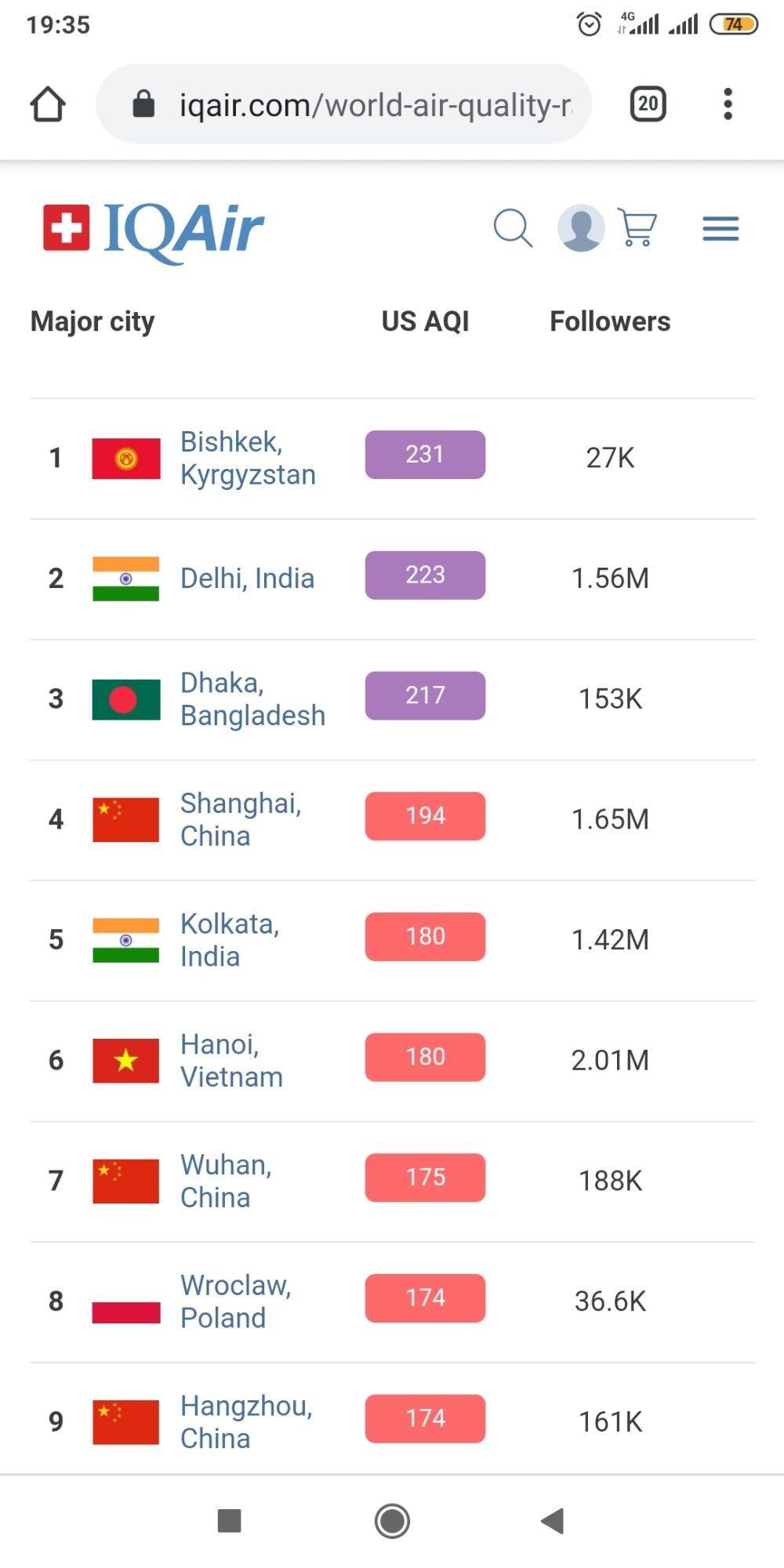 В рейтинге крупнейших городов мира по качеству воздуха World Air Quality на 19.30 Бишкек находится на первом месте.