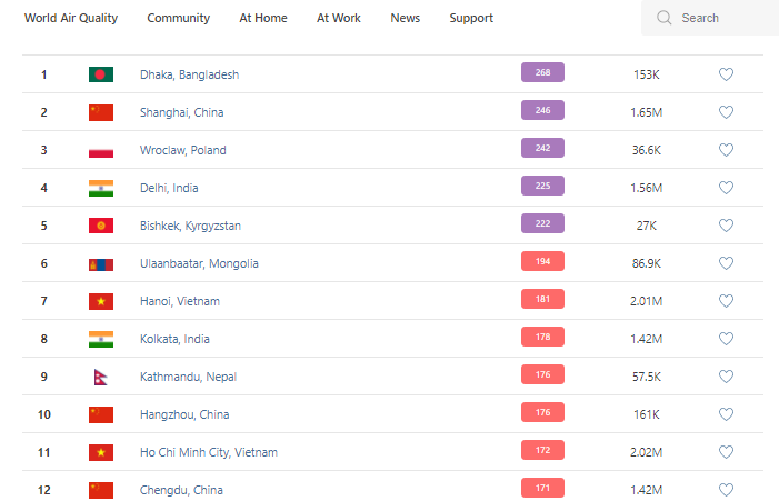 В рейтинге крупнейших городов мира по качеству воздуха World Air Quality Бишкек на 9.30 опустился на пятое место.