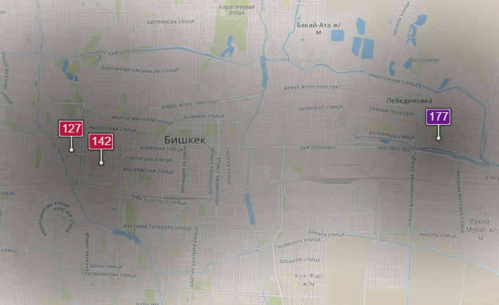 - в районе улиц Бейшеналиевой/Токтогула. Уровень загрязнения превышен в 3,71 раза: PM2.5 среднесуточный — 130 мкг/м³, на момент измерения — 124 мкг/м³;