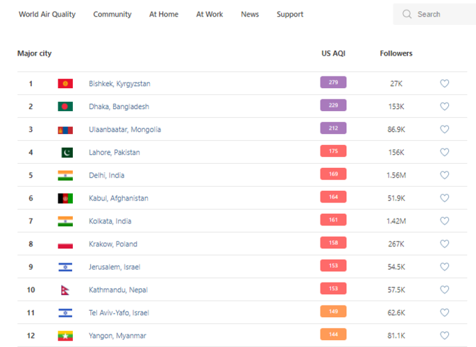 В рейтинге крупнейших городов мира по качеству воздуха World Air Quality Бишкек на 19.30 поднялся на первое место.