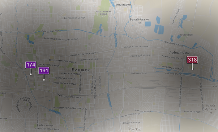 - в районе улиц Бейшеналиевой/Токтогула. Уровень загрязнения превышен в 4,37 раза: PM2.5 среднесуточный — 153 мкг/м³, на момент измерения — 174 мкг/м³;