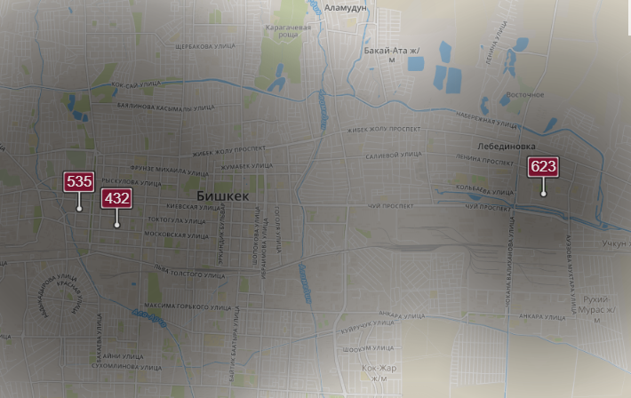 - в районе улиц Бейшеналиевой/Токтогула. Уровень загрязнения превышен в 7,37 раза: PM2.5 среднесуточный — 258 мкг/м³, на момент измерения — 535 мкг/м³;