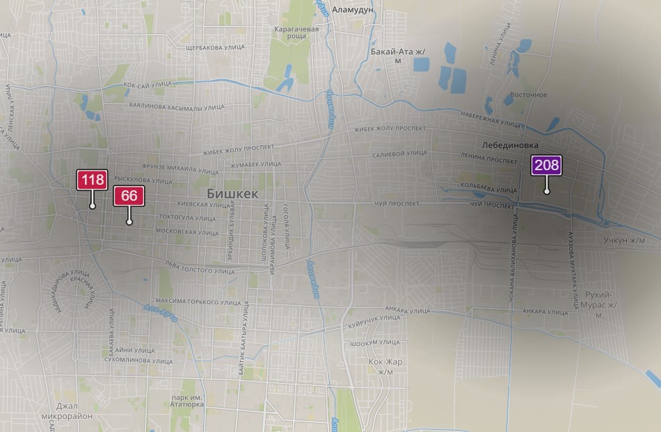 - в районе улиц Бейшеналиевой/Токтогула. Уровень загрязнения превышен в 6,4 раза: PM2.5 среднесуточный — 244 мкг/м³, на момент измерения — 118 мкг/м³;