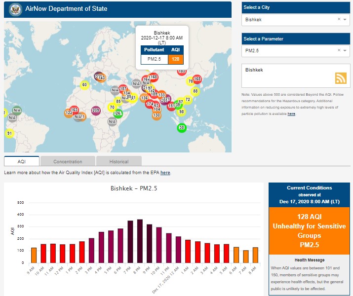 Посольство США в Кыргызстане также установило датчик. Он показывает индекс качества воздуха в режиме онлайн. Информация обновляется ежечасно.
