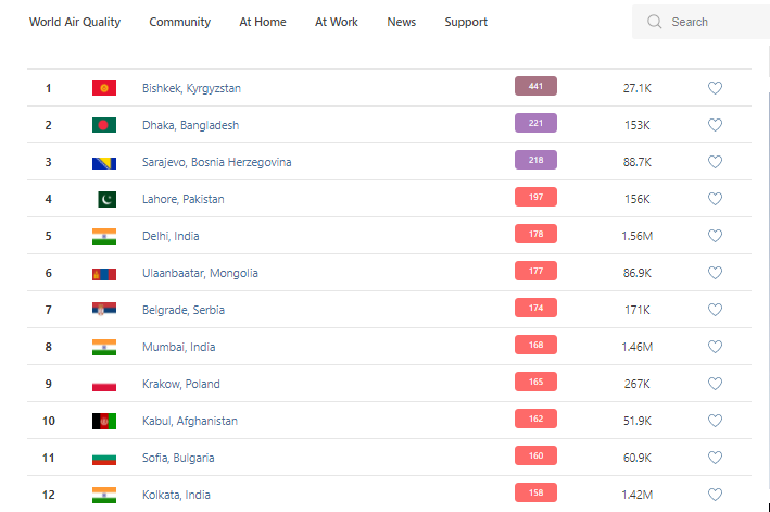 В рейтинге крупнейших городов мира по качеству воздуха World Air Quality Бишкек на 19.30 вновь поднялся на первую строчку.