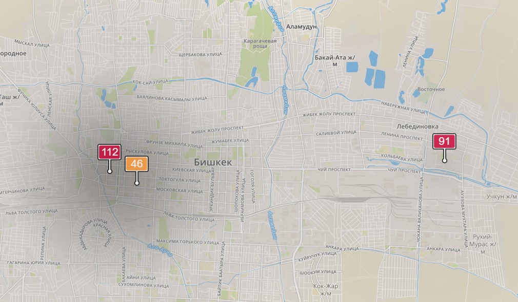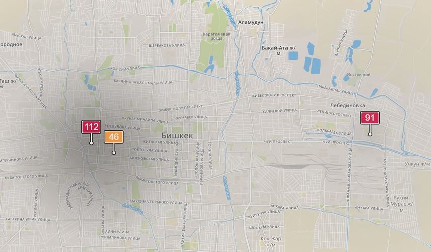- в районе улиц Бейшеналиевой/Токтогула. Уровень загрязнения превышен в 6,42 раза: PM2.5 среднесуточный — 225 мкг/м³, на момент измерения — 113 мкг/м³;