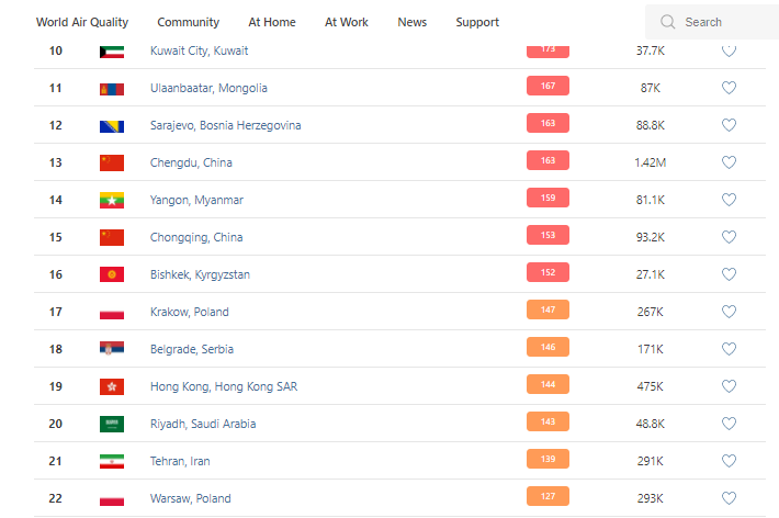 В рейтинге крупнейших городов мира по качеству воздуха World Air Quality Бишкек на 9.30 опустился на 16-е место.