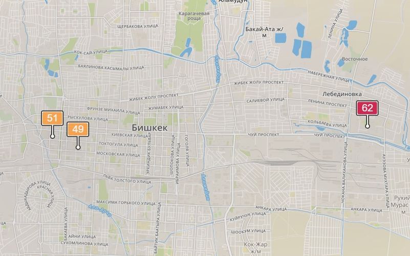 - в районе улиц Бейшеналиевой/Токтогула. Уровень загрязнения превышен в 1,57 раза: PM2.5 среднесуточный — 55 мкг/м³, на момент измерения — 51 мкг/м³;