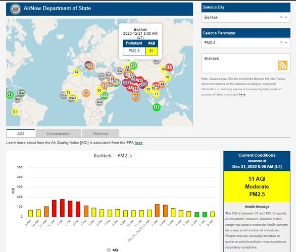 Посольство США в Кыргызстане также установило датчик. Он показывает индекс качества воздуха в режиме онлайн. Информация обновляется ежечасно.
