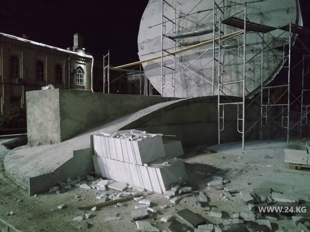 Еще недостроенное сооружение уже дважды пострадало от рук вандалов. Во время октябрьских событий митингующие разбили мраморные плиты недостроенного памятника, сломали бордюр возле скульптурной композиции. Кусками от мрамора участники беспорядков закидывали сотрудников правоохранительных органов. Недавно вандалы разрисовали мемориал зеленой краской. По центру круга написали слово «Аллах» на арабском языке. Кому это понадобилось, так и не выяснили.«Работы немного приостанавливали из-за холодов. С деньгами проблем нет никаких, мы с мэрией Бишкека партнеры, она нам помогает. Сейчас каменщики потихоньку работают, устанавливают мрамор на сфере», — говорит она.
