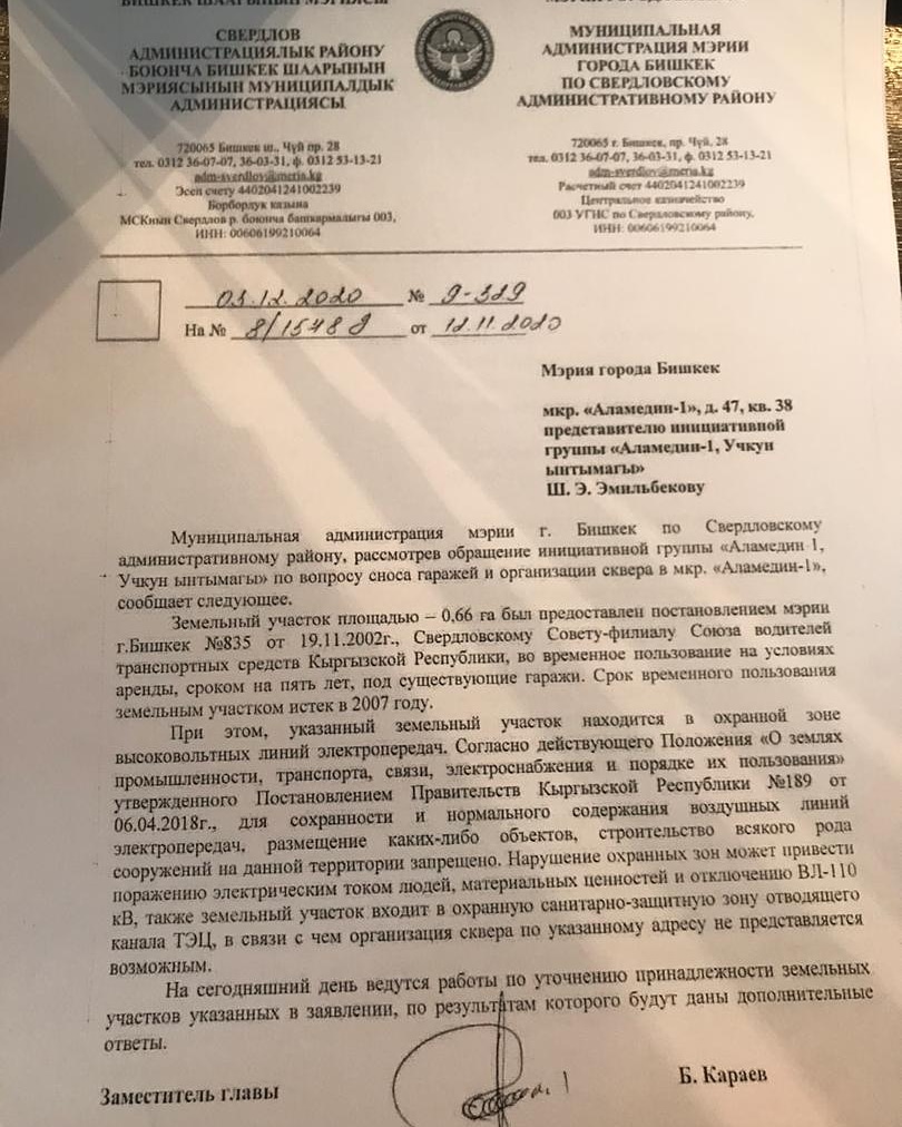 «В документе отмечается, что срок аренды этих гаражей истек еще в 2007 году, то есть почти 14 лет они стоят тут незаконно? Если даже не будут строить сквер, то пусть снесут незаконные объекты», — сказал Шер Эмильбеков.