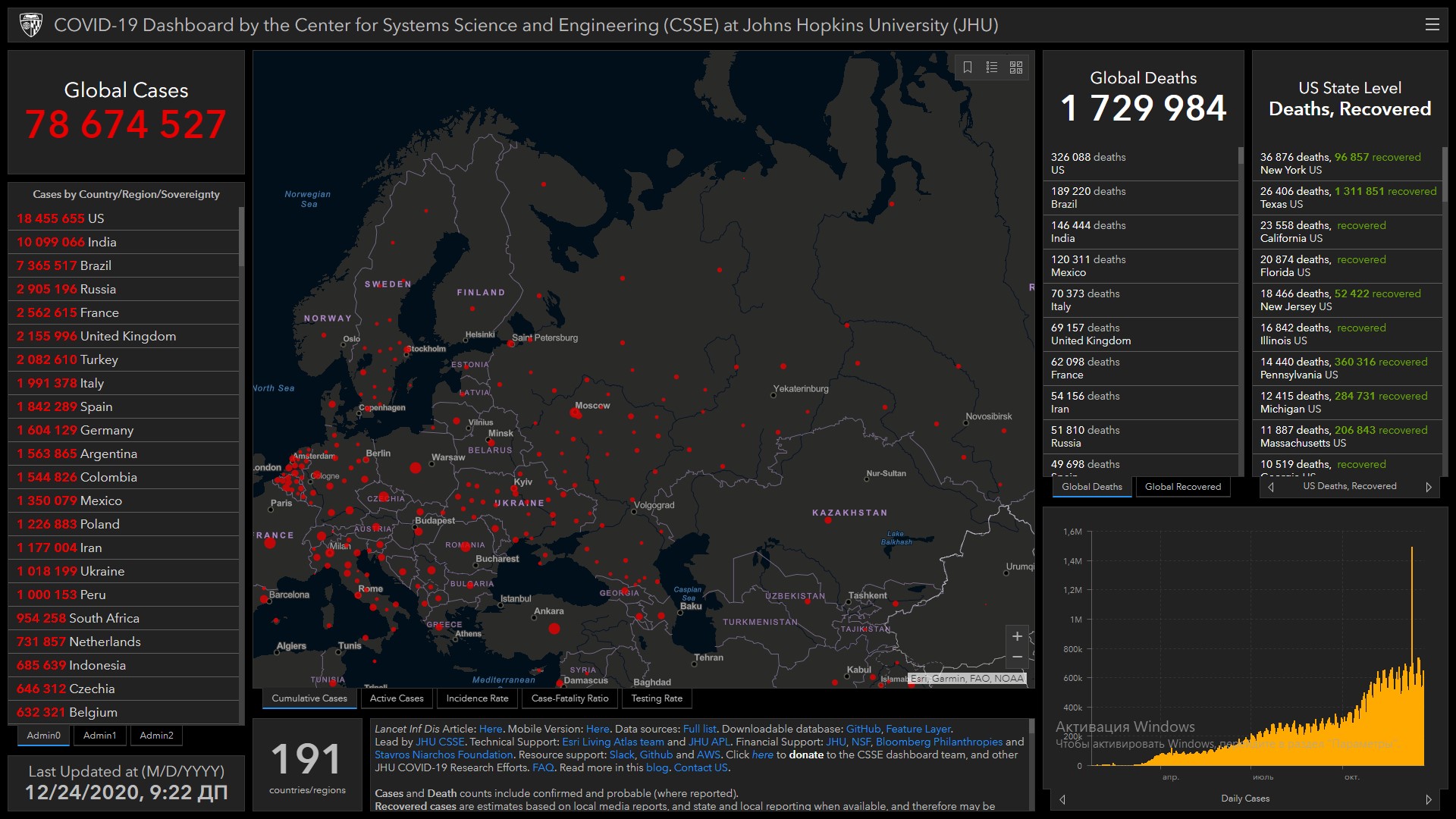 Всего в мире коронавирусом заразились 78 миллионов 674 тысячи 527 человек. Больше всего зараженных в США (18 миллионов 455 тысяч 655), Индии (10 миллионов 99 тысяч 66), Бразилии (7 миллионов 365 тысяч 517), России (2 миллиона 905 тысяч 196), Франции (2 миллиона 562 тысячи 615), Великобритании (2 миллиона 155 тысяч 996), Турции (2 миллиона 82 тысячи 610), Италии (1 миллион 991 тысяча 378), Испании (1 миллион 842 тысячи 289), Германии (1 миллион 604 тысячи 129) и Аргентине (1 миллион 563 тысячи 865).