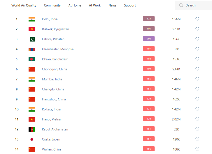 В рейтинге крупнейших городов мира по качеству воздуха World Air Quality Бишкек на 19.30 поднялся на второе место.