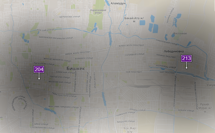 - в микрорайоне «Аламедин-1». Уровень загрязнения превышен в 12,08 раза: PM2.5 среднесуточный — 423 мкг/м³, на момент измерения — 213 мкг/м³.