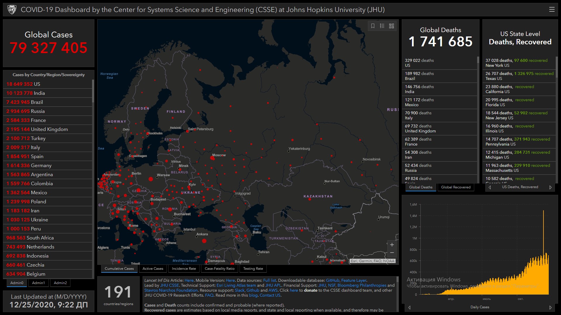 Всего в мире коронавирусом заразились 79 миллионов 327 тысяч 405 человек. Больше всего зараженных в США (18 миллионов 649 тысяч 352), Индии (10 миллионов 123 тысячи 778), Бразилии (7 миллионов 423 тысячи 945), России (2 миллиона 934 тысячи 695), Франции (2 миллиона 584 тысячи 333), Великобритании (2 миллиона 195 тысяч 144), Турции (2 миллиона 100 тысяч 712), Италии (2 миллиона 9 тысяч 317), Испании (1 миллион 854 тысячи 951), Германии (1 миллион 614 тысяч 336) и Аргентине (1 миллион 563 тысячи 865).