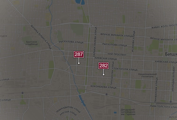 - в районе улиц Московской/Уметалиева. Уровень загрязнения превышен в 8,34 раза: PM2.5 среднесуточный — 292 мкг/м³, на момент измерения — 287 мкг/м³;