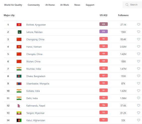 В рейтинге крупнейших городов мира по качеству воздуха World Air Quality Бишкек на 19.30 поднялся на первое место.