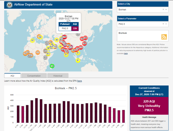 Посольство США в Кыргызстане также установило датчик. Он показывает индекс качества воздуха в режиме онлайн. Информация обновляется ежечасно.