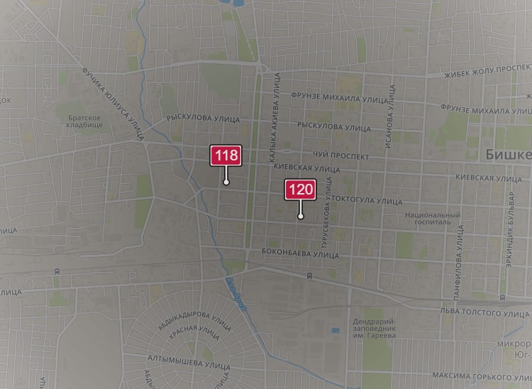 - в районе улиц Бейшеналиевой/Токтогула Уровень загрязнения превышен в 5,82 раза: PM2.5 среднесуточный — 204 мкг/м³, на момент измерения — 118 мкг/м³;