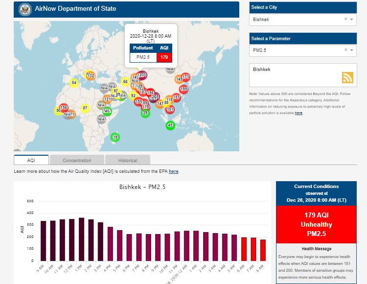 Посольство США в Кыргызстане также установило датчик. Он показывает индекс качества воздуха в режиме онлайн. Информация обновляется ежечасно.