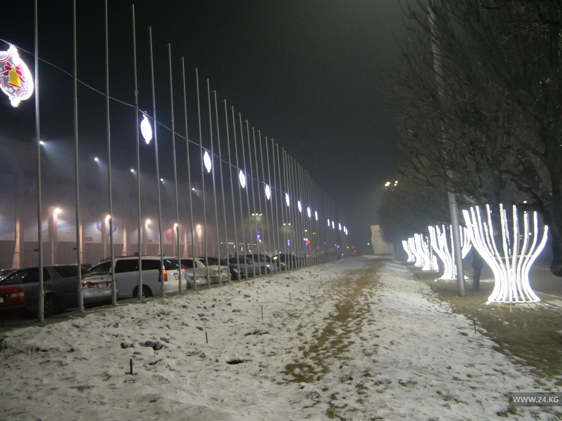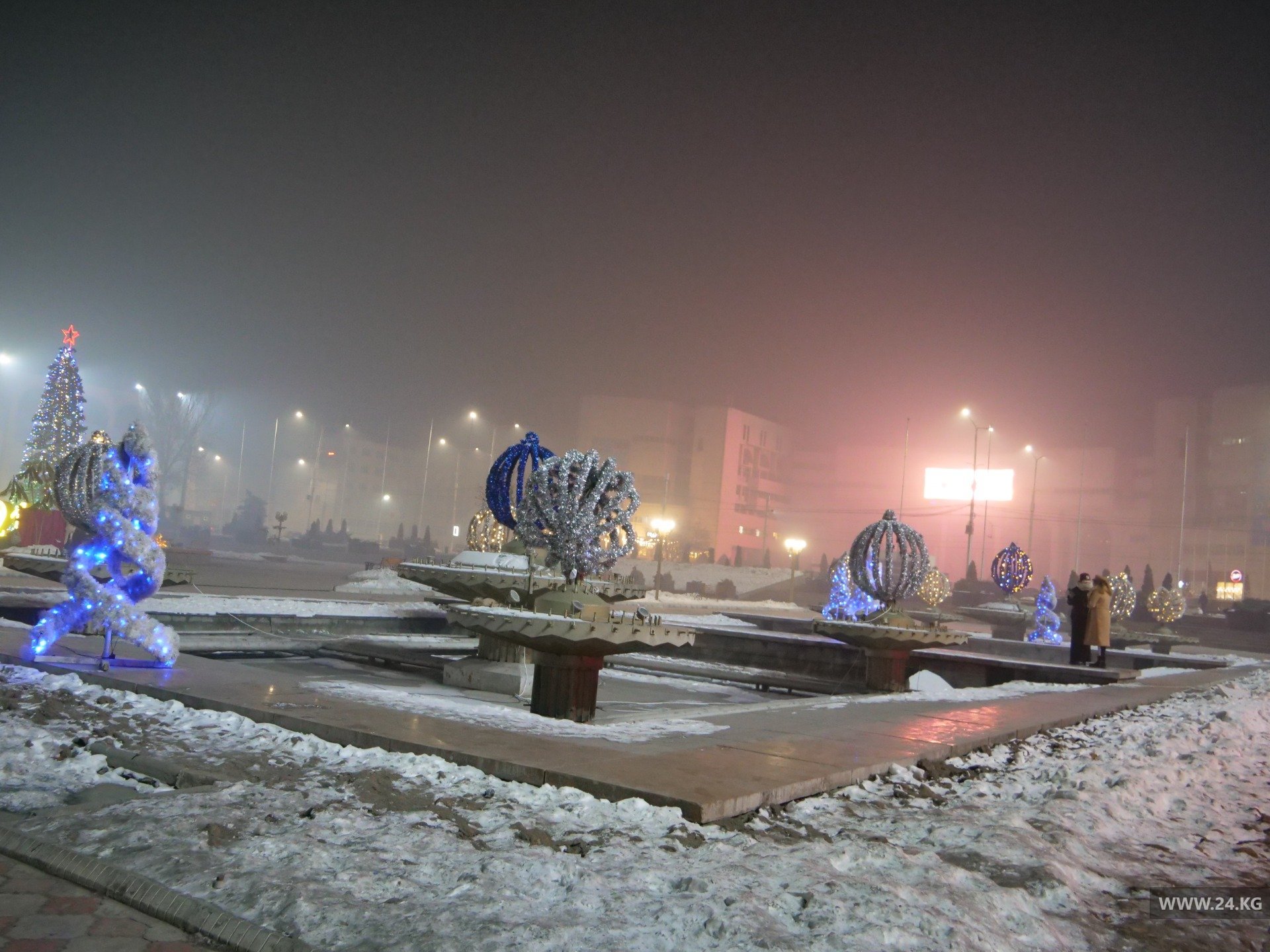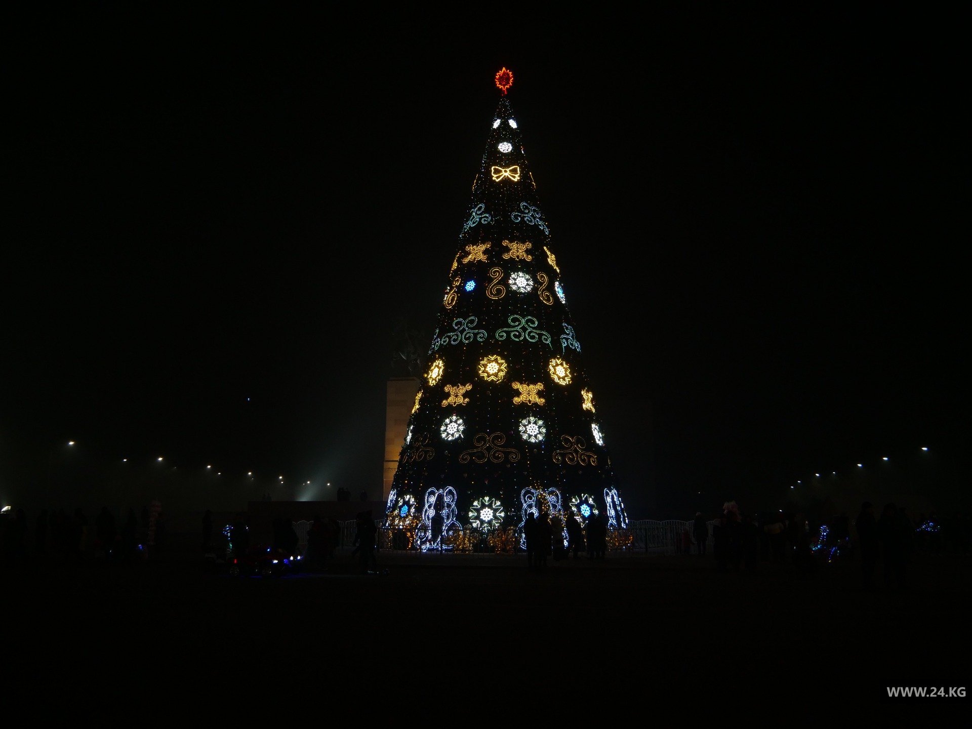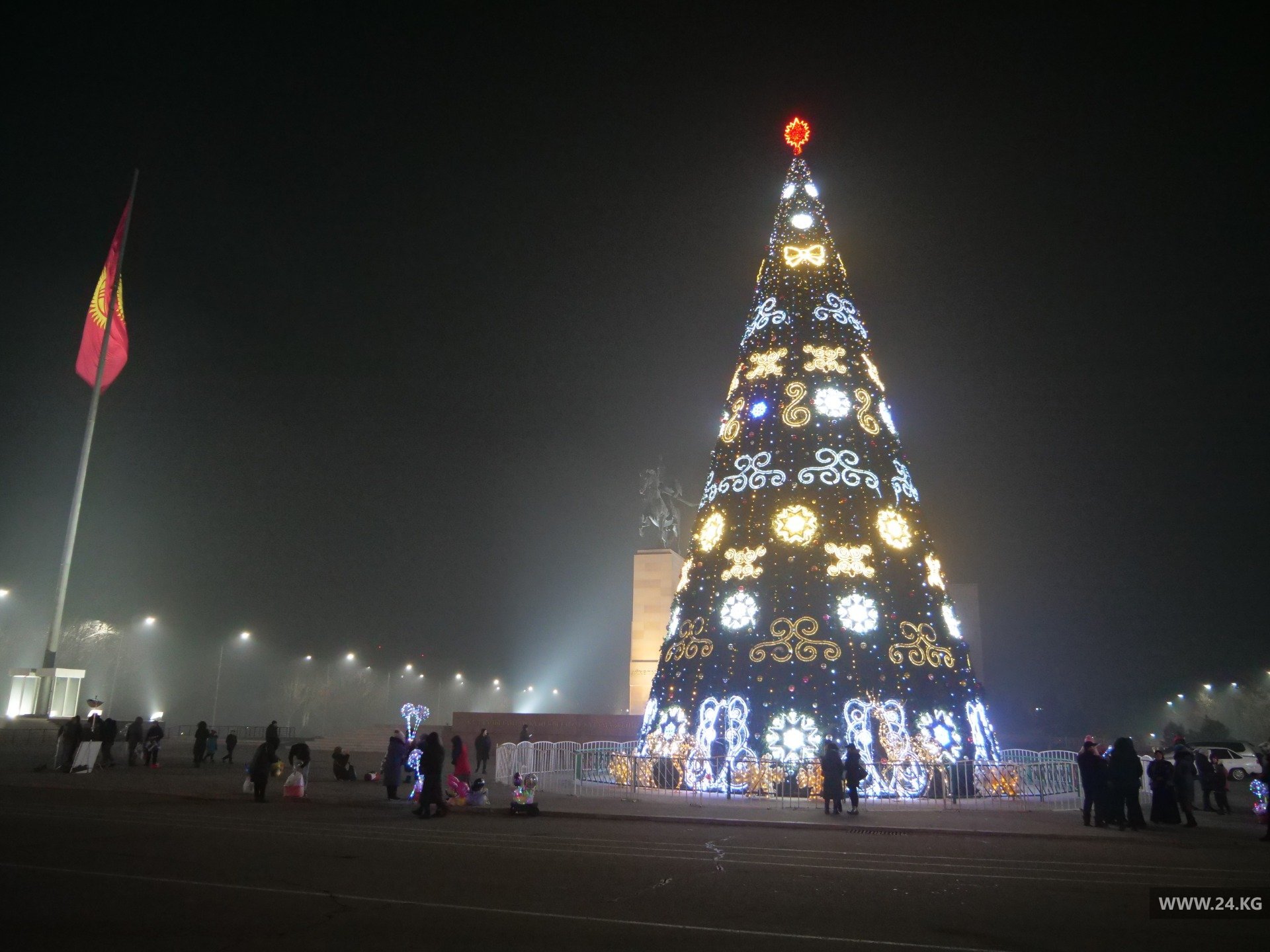 Поэтому, минуя кризис, из местного бюджета на новогоднюю красу выделили аж 600 тысяч сомов. Высота праздничного дерева на центральной площади составляет 11 метров. Улицы не украшали.