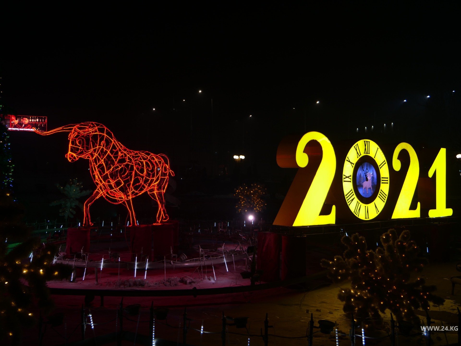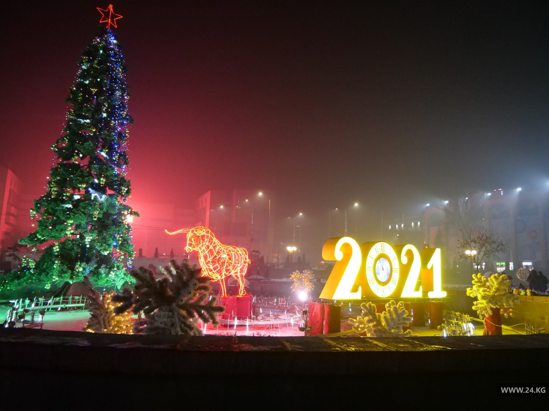 Традиционно елку на центральной площади зажгли 10 декабря. Столичный муниципалитет решил отказаться от праздничного салюта и покупки новых декораций. На сэкономленные деньги мэрия купила подарки к Новому году для малоимущих и ветеранов.Двадцатипятиметровую новогоднюю красу украшают 1,5 километра светодиодных гирлянд, 650 игрушек, более 100 снежинок и узоров в национальном стиле. В центре площади установлен главный символ года — инсталляция быка, выполненная из металла, и цифра «2021».