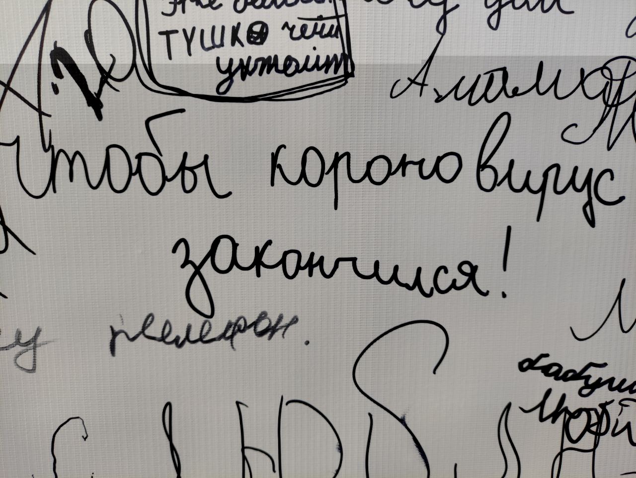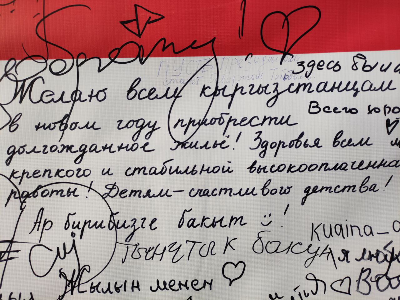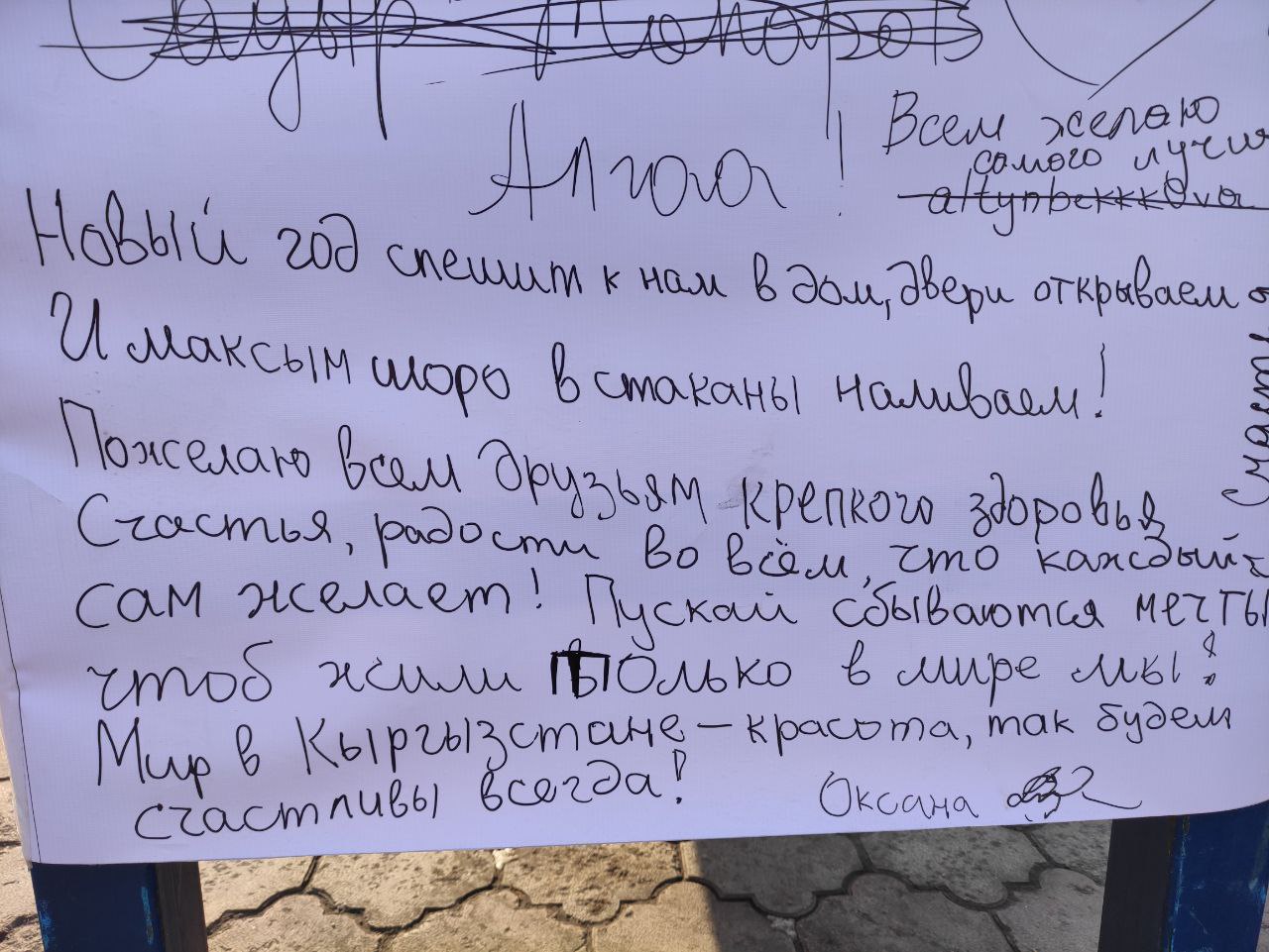 На доске пожеланий горожане упомянули имена некоторых политиков. Пожелали успехов главе ГКНБ Камчыбеку Ташиеву и мудрости правительству. А кто-то написал, что хочет нормального президента.