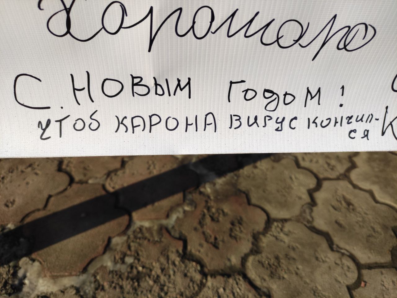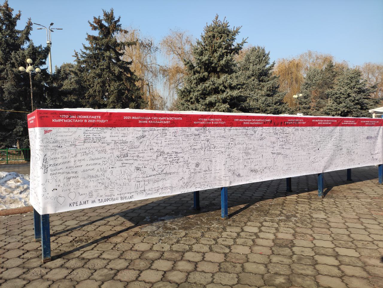 В Бишкеке каждый кыргызстанец в эти дни может поздравить с Новым, 2021 годом кого угодно и написать свои пожелания. Стенд установлен у кинотеатра «Ала-Тоо», где любой прохожий может оставить короткую запись.