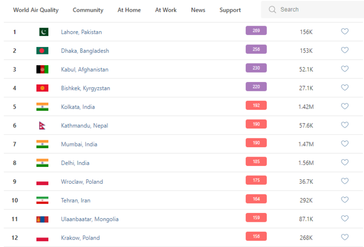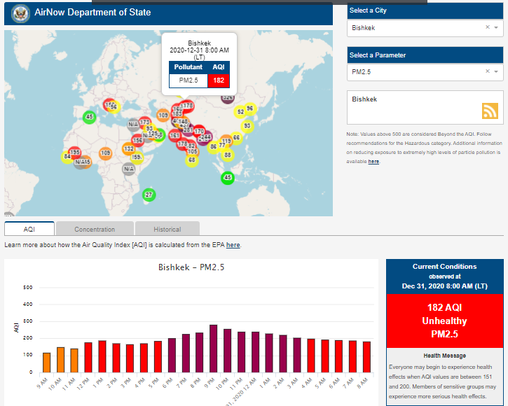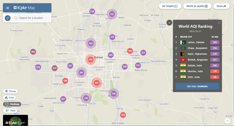 В рейтинге крупнейших городов мира по качеству воздуха World Air Quality Бишкек находится на четвертом месте.