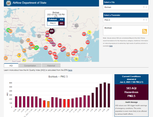 Информация обновляется каждый час. На 19.00 индекс качества воздуха в районе дипломатической миссии — 583 (AQI).