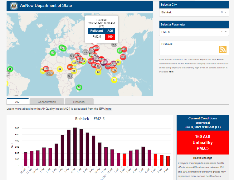 В рейтинге крупнейших городов мира по качеству воздуха World Air Quality Бишкек опять находится на первом месте.