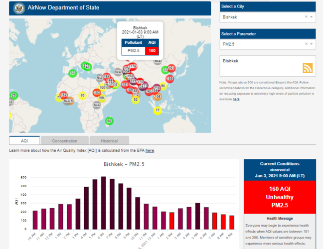 Информация обновляется каждый час. На 9.00 индекс качества воздуха в районе дипломатической миссии — 160 (AQI).