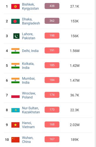 В 19.30 статус города отмечен как «опасно» (Hazardous). Индекс качества воздуха, по данным сайта, составляет 438 (AQI).
