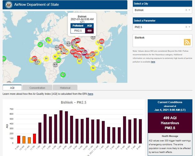 Информация обновляется каждый час. На 8.00 индекс качества воздуха в районе дипломатической миссии — 499 (AQI).