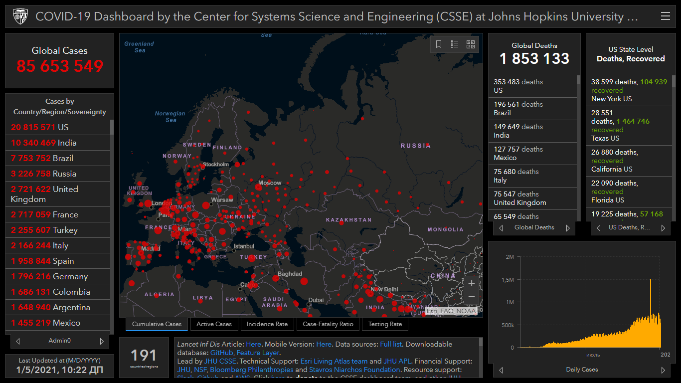 Всего в мире коронавирусом заразились 85 миллионов 653 тысячи 549 человек. Больше всего зараженных в США (20 миллионов 815 тысяч 571), Индии (10 миллионов 340 тысяч 469), Бразилии (7 миллионов 753 тысячи 752), России (3 миллиона 226 тысяч 758), Великобритании (2 миллиона 721 тысяча 622), Франции (2 миллиона 717 тысяч 59), Турции (2 миллиона 255 тысяч 607), Италии (2 миллиона 166 тысяч 244), Испании (1 миллион 958 тысяч 844), Германии (1 миллион 796 тысяч 216) и Колумбии (1 миллион 686 тысяч 131).