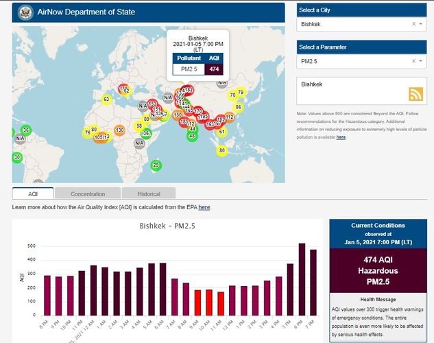 В 19.30 статус города отмечен как «опасный» (Hazardous). Индекс качества воздуха, по данным сайта, составляет 455 (AQI).