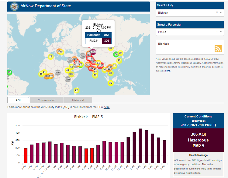 Информация обновляется каждый час. На 19.00 индекс качества воздуха в районе дипломатической миссии — 306 AQI).