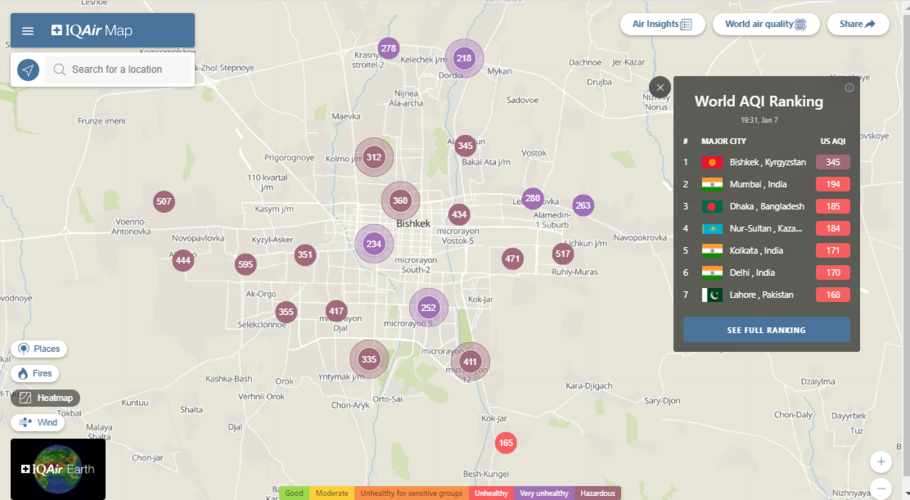В рейтинге крупнейших городов мира по качеству воздуха World Air Quality Бишкек по-прежнему находится на первом месте.
