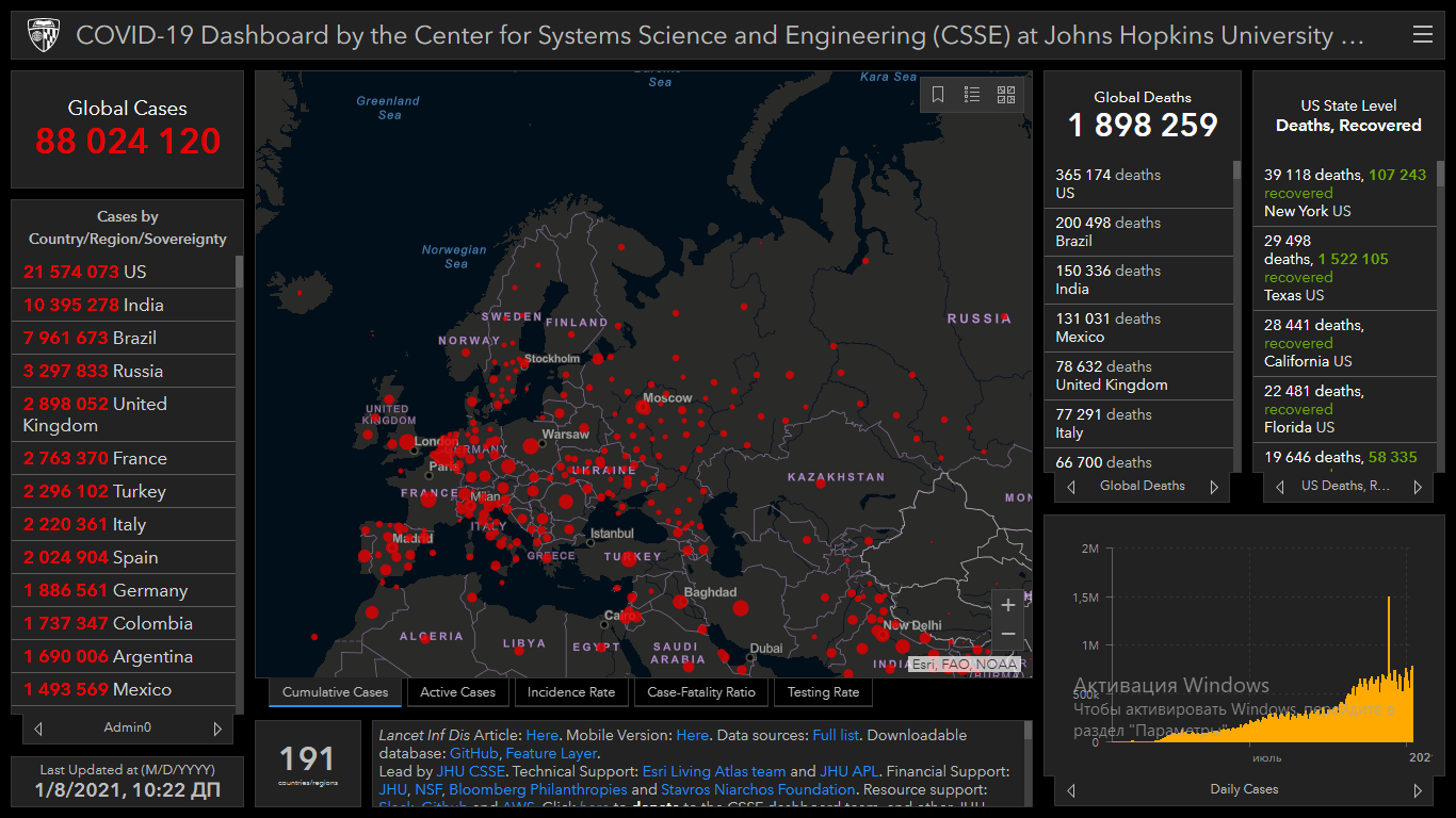Всего в мире коронавирусом заразились 88 миллионов 24 тысячи 120 человек. Больше всего зараженных в США (21 миллион 574 тысячи 73), Индии (10 миллионов 395 тысяч 278), Бразилии (7 миллионов 961 тысяча 673), России (3 миллиона 297 тысяч 833), Великобритании (2 миллиона 898 тысяч 52), Франции (2 миллиона 763 тысячи 370), Турции (2 миллиона 296 тысяч 102), Италии (2 миллиона 220 тысяч 361), Испании (2 миллиона 24 тысячи 904), Германии (1 миллион 886 тысяч 561) и Колумбии (1 миллион 737 тысяч 347).
