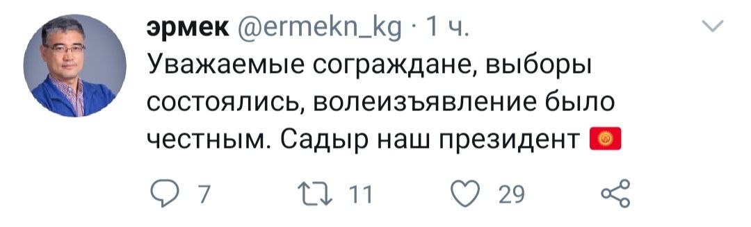 Некоторые пользователи ставят под сомнение данные о явке и в целом результаты выборов. И обращают внимание на низкую явку избирателей. Журналистка и ведущая Назира Айтбекова сообщила, что вовсе не пошла на выборы, так как считает, что они нелегитимны, и не признает их.Напомним, что сегодня в республике прошли досрочные выборы главы государства и плебисцит по определению формы правления.
